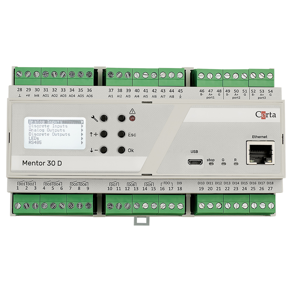 - Можливість підключення підпорядкованих пристроїв (модулі вводу/виводу, частотні перетворювачі, інтелектуальні датчики тощо) за протоколом MODBUS RTU (режим Master);