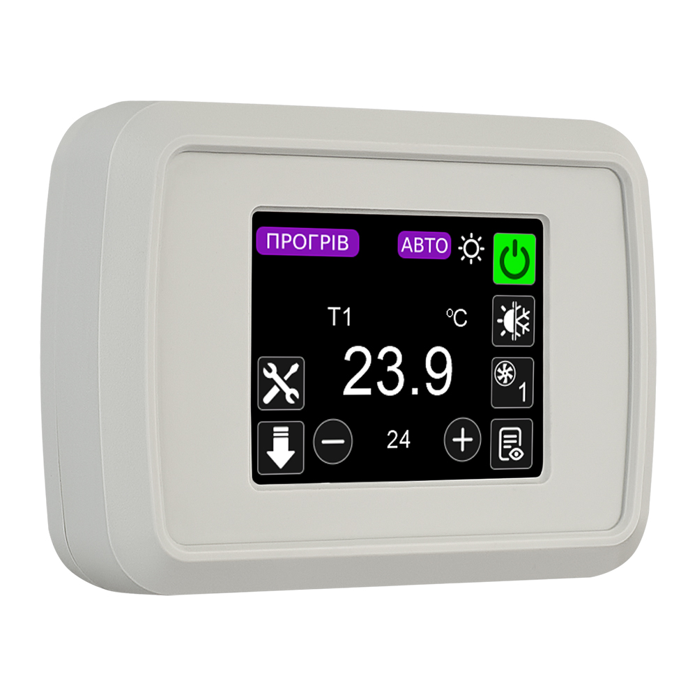 Пульт MTP 28W – це прилад людино-машинного інтерфейсу (HMI) призначений для керування системами вентиляції та кондиціонування. Підключення до контролера здійснюється по шині RS-485, протокол – MODBUS RTU. Пульт складається з кольорового TFT дисплею розміром 2.8”, мікропроцесора та інтерфейсу RS-485.