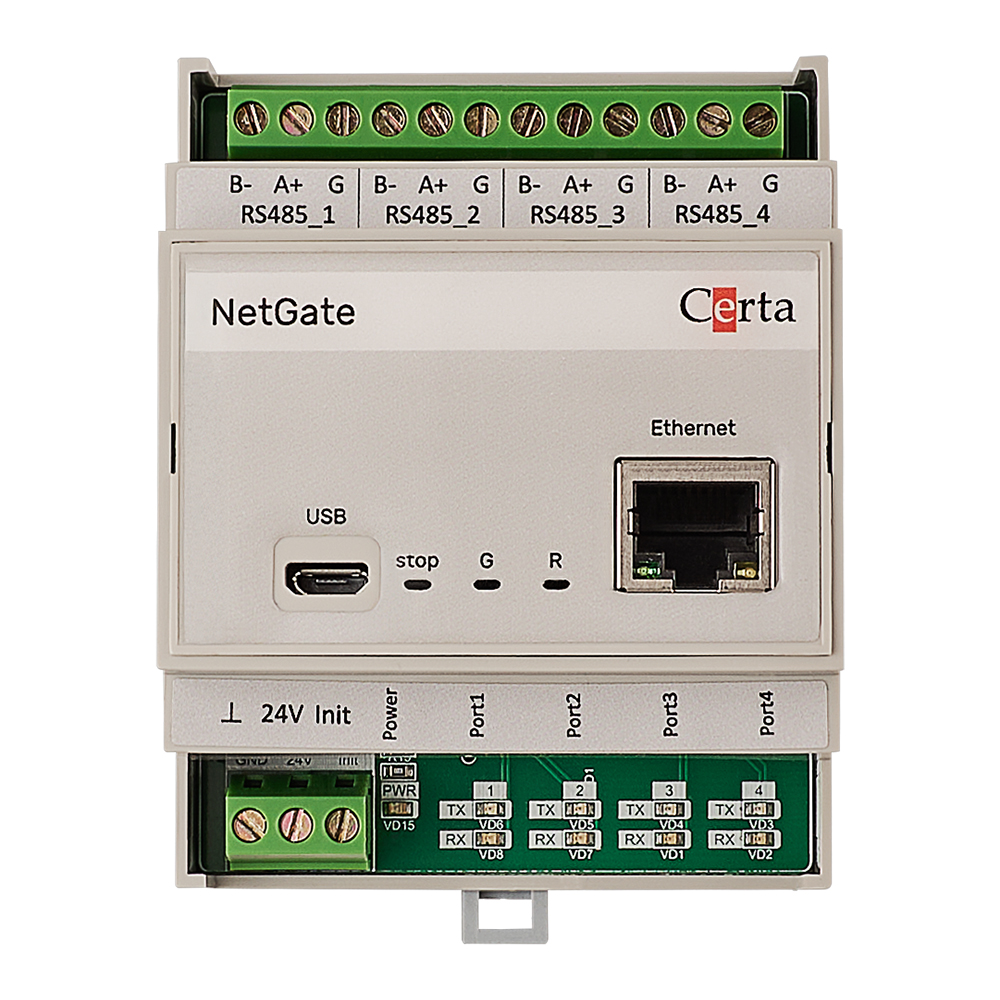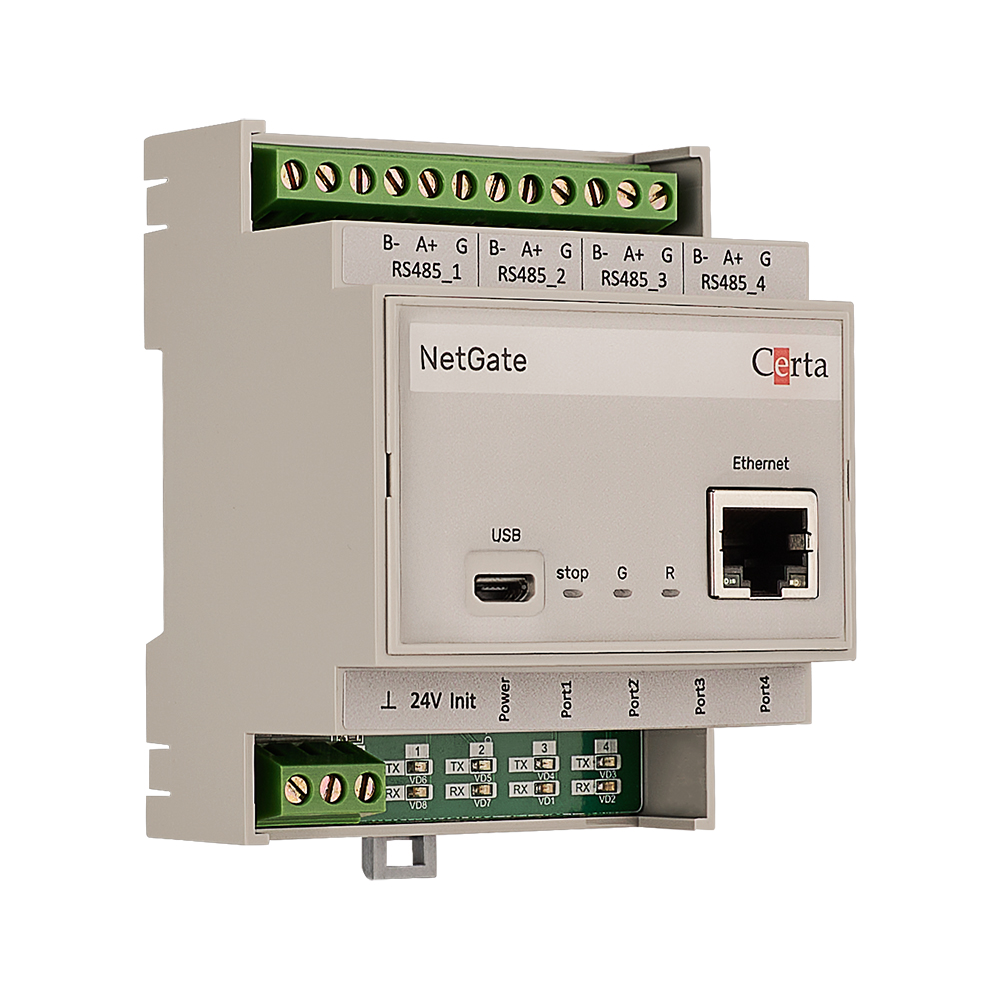 Шлюз NetGate–комунікаційний контролер, який програмується в середовищі ViCS і дозволяє передавати дані в мережах RS-485 та Ethernet по протоколу MODBUS. Основне призначення – шлюз MODBUS RTU/TCP.